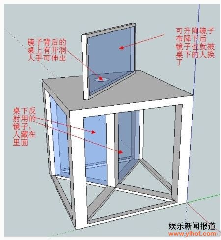 最后一个“镜中手”的魔术,更是引来最多吐槽,“桌子下面藏的是柜子,柜子里面藏着人,桌面上的镜子是可以升降的。”微博上,网友“一名童鞋”发布微博称自己已经看透了刘谦的魔术,“其实很简单”,随后“一名童鞋”将一张自己绘制的立体揭秘图上传到微博并转发给了刘谦(见上图)。该图清晰地说明了刘谦身旁的桌子下用镜子搭出了一个三角体空间,而人藏在镜子后面。桌面上桌面下共有两面镜子,其中一面镜子后开了一个洞口,桌下人可以将手伸出来。此外,当丝绒布降下,桌下人立即将台面上的镜子换掉。